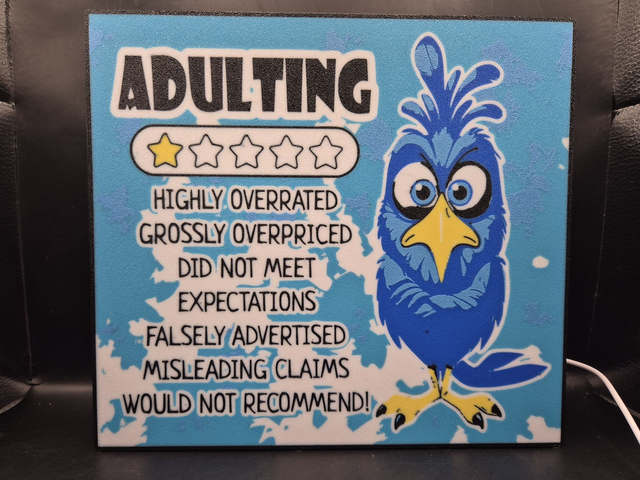This 3D Printed Lightbox is a unique and eye-catching addition to any indoor space. With its design featuring a Light Up Sign Adulting Would Not Recommend, this lightbox is sure to stand out.